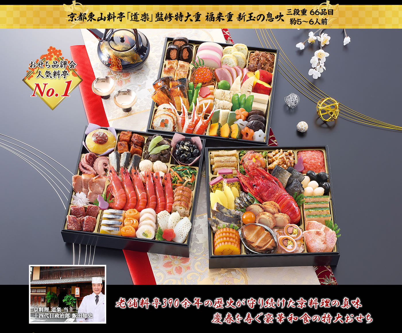 2:32,000円 京都東山料亭「道楽」監修特大重おせち 福来重「新玉の息吹(あらたまのいぶき)」(3段・66品・5〜6人前)