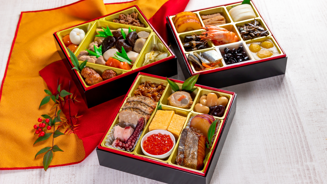 おせち料理の基本は三段重ねで、各段には祝い肴、煮物椀、八寸といった異なるカテゴリーの料理が盛られます。この三段重ねは、新年の祝いと日本の伝統を色鮮やかかつ美味しく表現するための形式とされています。