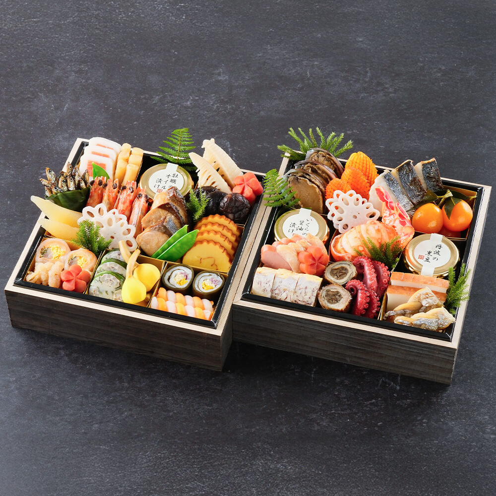 近江牛A5ランクのローストビーフ、活きたまま調理した特大海老の艶煮、じっくり炊き上げたウナギの山椒煮など、贅を尽くした逸品の数々が三段重に彩りよく盛り付けられています。
